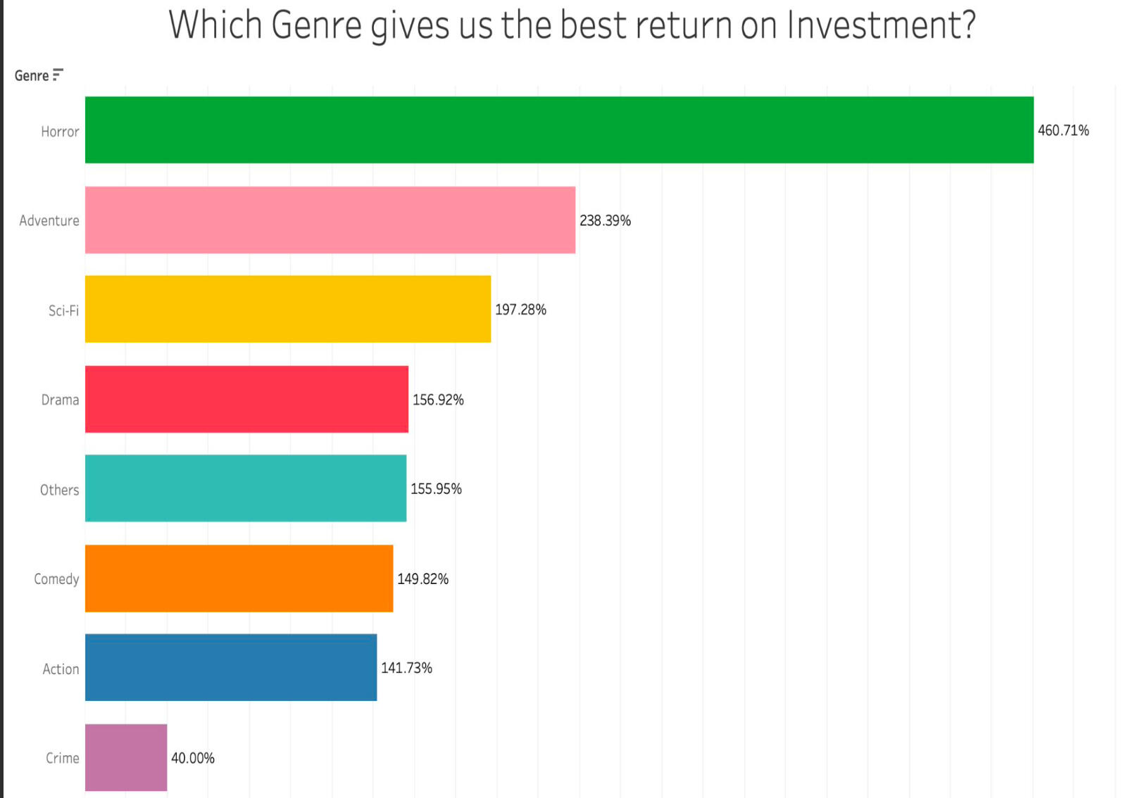 Horror films deliver the highest ROI at 460% due to low budgets and average revenue.