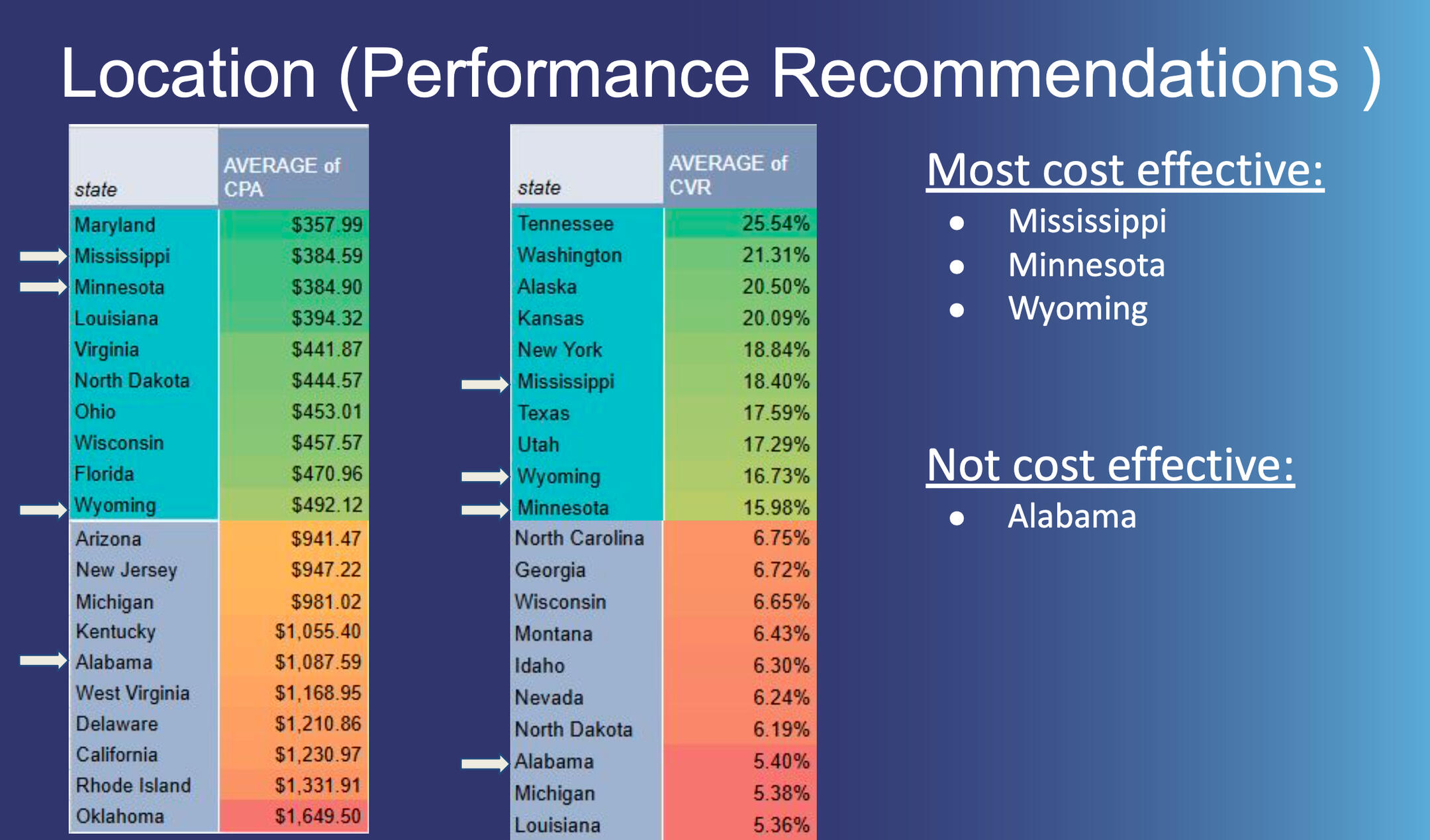 Top-performing states: Mississippi, Minnesota, and Wyoming for cost-effectiveness; Iowa, New York, and Vermont for brand viewability.