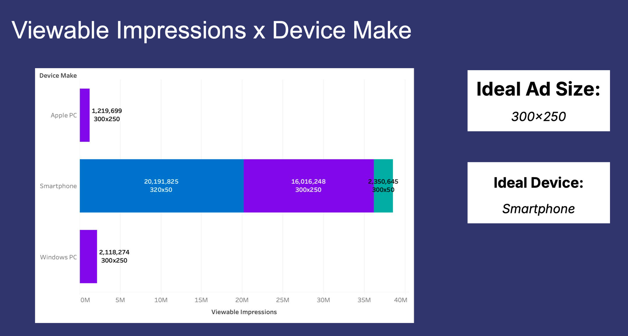 Identified optimal ad sizes (300x250, 320x50) and devices (smartphones) for cross-platform success.