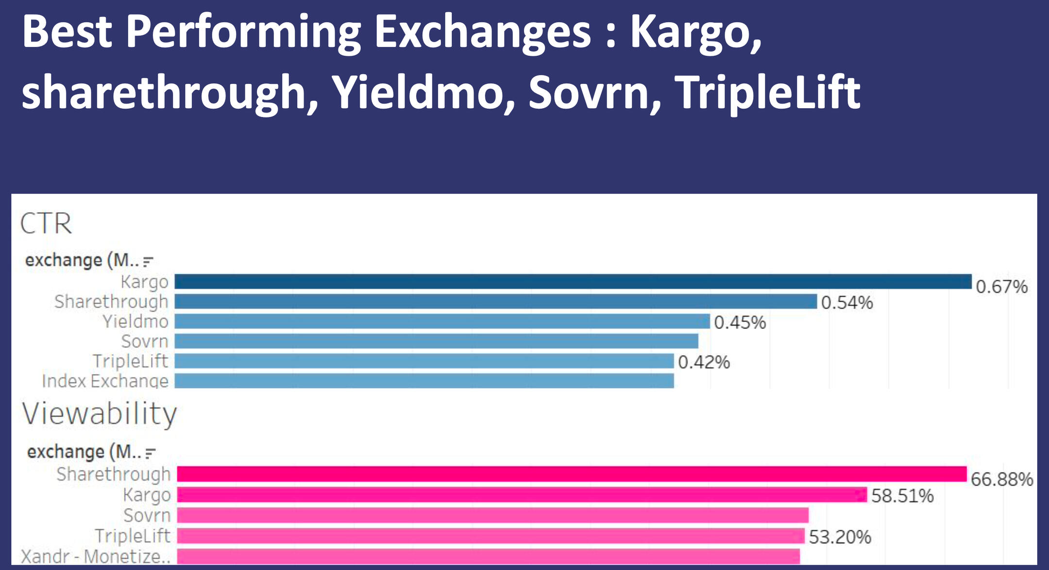 Allocate higher budgets to Sovrn for cost-effective outreach and viewability while testing other top-performing exchanges like Kargo and TripleLift.