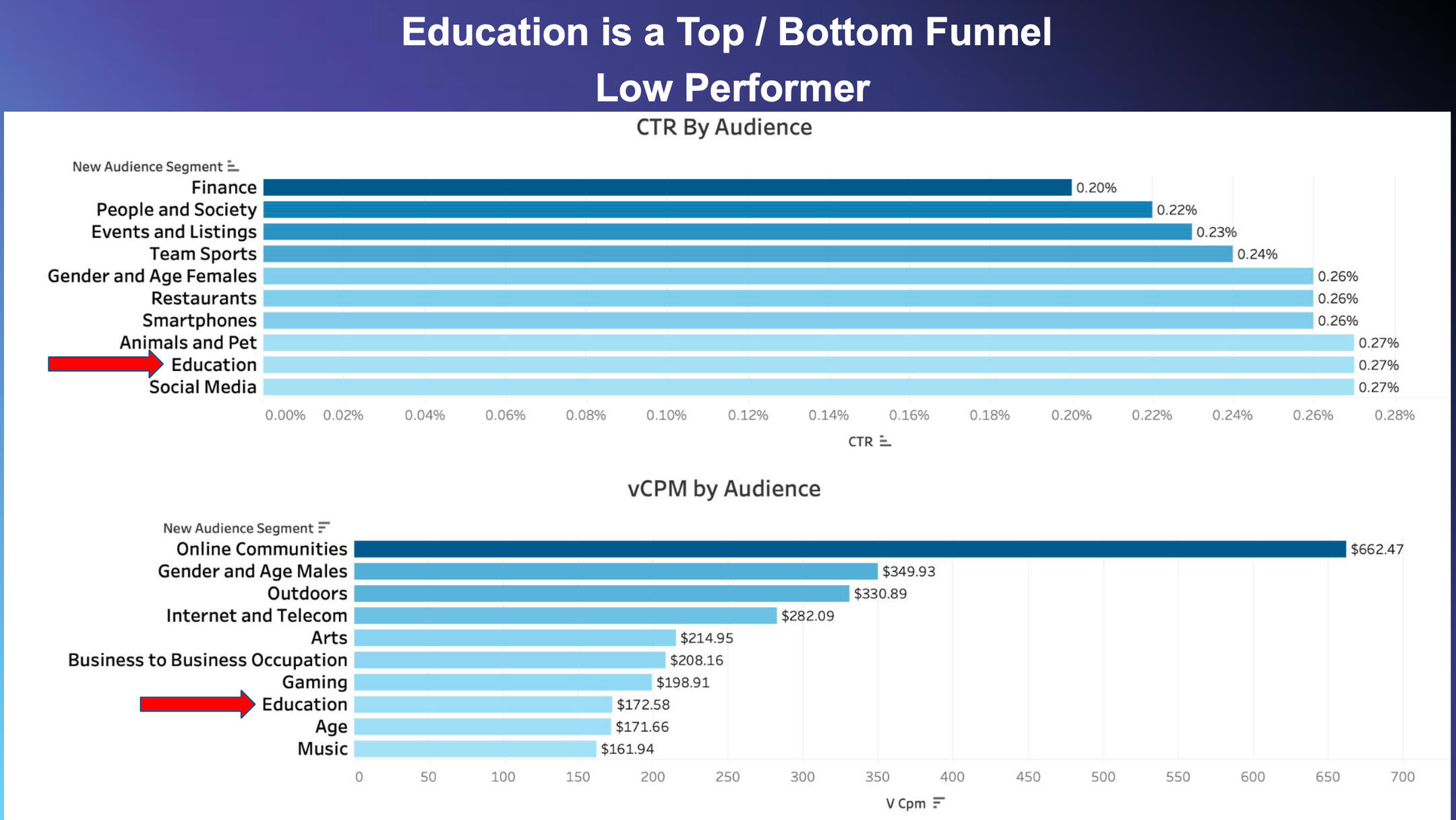Prioritize buyer propensity and interest propensities segments, reallocating funds from underperforming audiences like "Education."