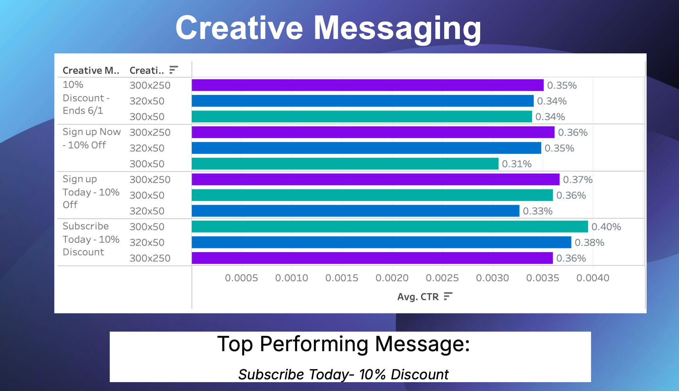 Creative optimizations: "Subscribe Today - 10% Discount" was the top-performing message, driving significant engagement.