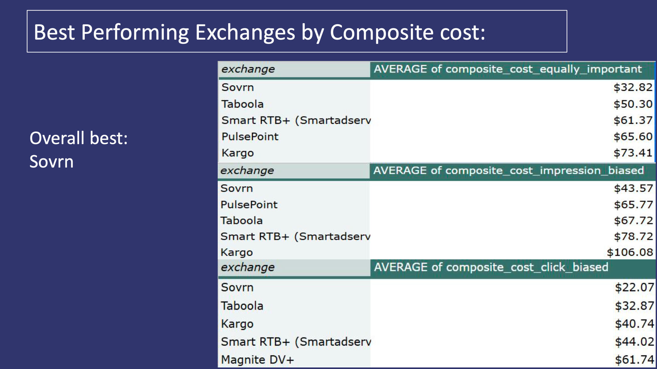 Determined top-performing ad exchanges, with Sovrn leading on cost-effectiveness.