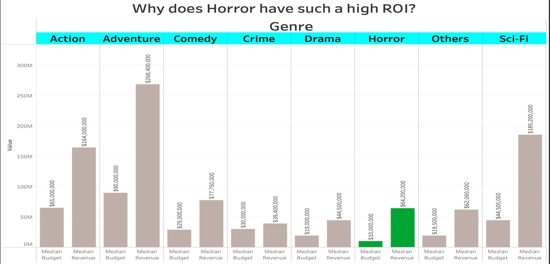Horror films are ideal for low-risk, high-return investments due to their low budget and strong audience appeal.