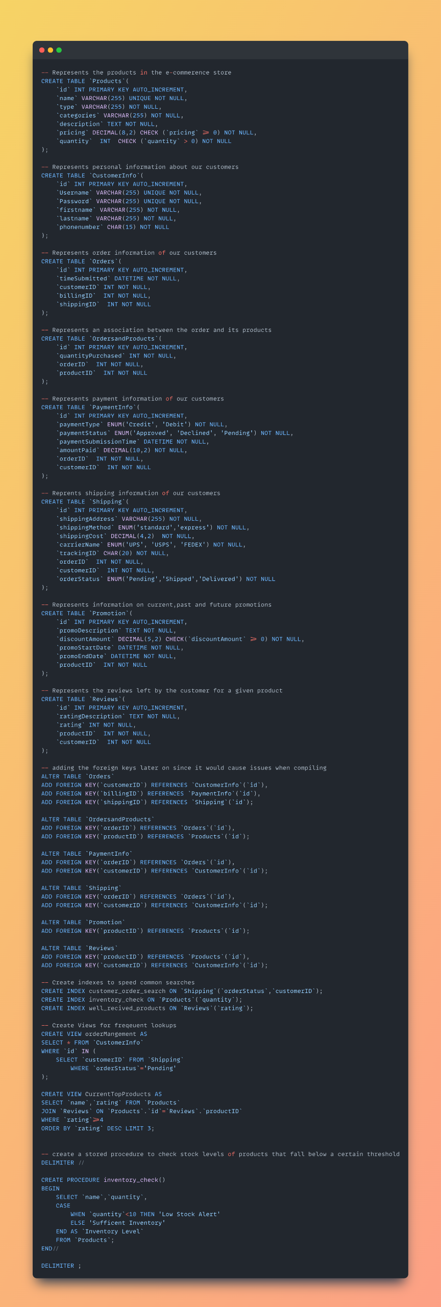 The project involved creating a comprehensive database to handle core e-commerce functionalities like managing products, customer orders, payment details, shipping information, promotions, and reviews. The database schema was designed with scalability, efficiency, and data integrity in mind, while maintaining privacy and excluding external tracking data.